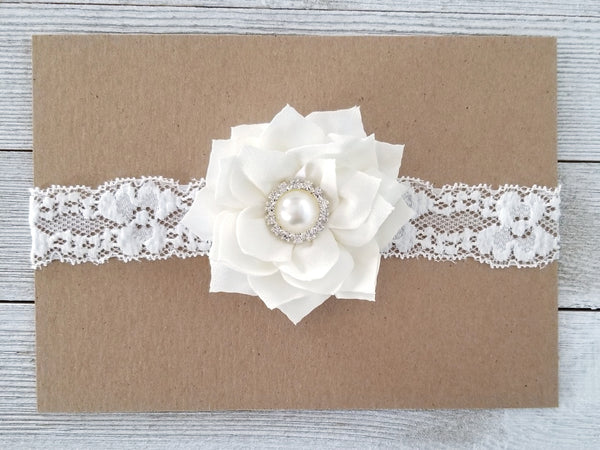 Ivory Lace Baby Headband, perfect for a Baptism, Wedding, or Confirmation.